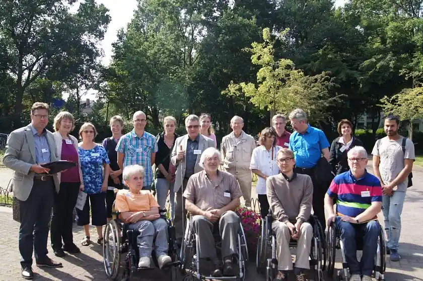 20 Interessierte beteiligten sich: Rollstuhl-Fahrer, Menschen mit Mobilitätsbeeinträchtigung und Menschen, die blind oder gehörlos sind. Bei einem Rundgang wurden vom Ankommen im Bad bis zum Ein- und Ausstieg ins Becken und den Umkleiden an verschiedenen Stationen Anregungen gesammelt. Die Gruppen wurden begleitet von Protokollführenden, die nachfragten und alle Ideen festhielten. Der Workshop wurde abgesprochen und vorbereitet mit Dr. Joachim Steinbrück, dem Landesbehindertenbeauftragten. Er wollte den Workshop genauso wie Jürgen Kathmann vom Senator für Umwelt, Bau und Verkehr unterstützen.