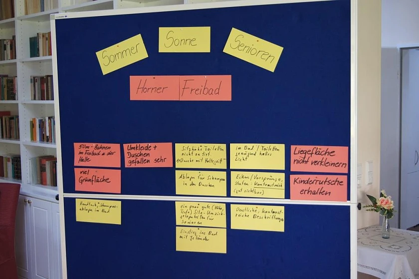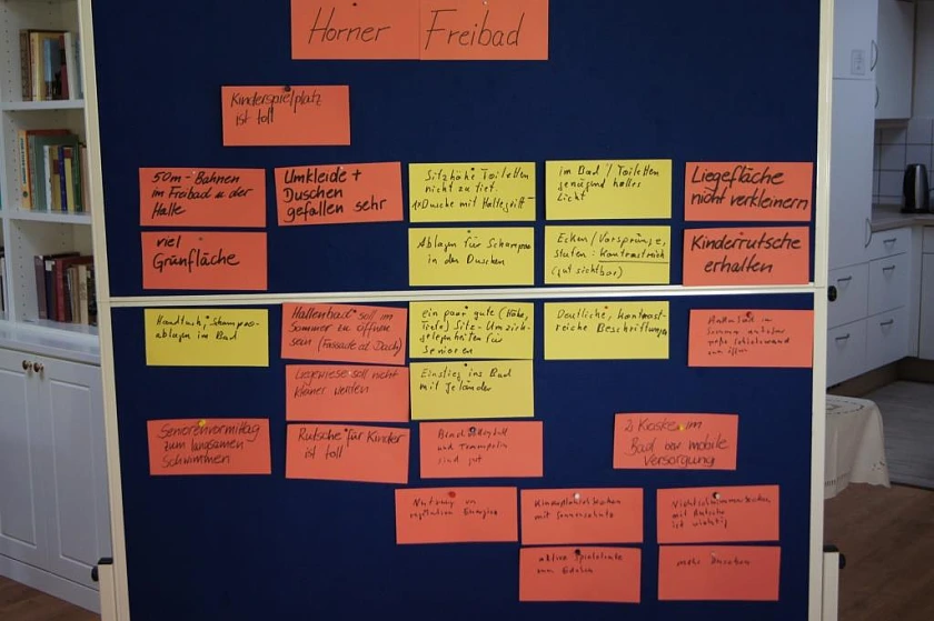 Aufgrund des kühlen Wetters wirkte das Bad relativ leer. Der Workshop für Stammgäste zählte 22 Teilnehmende, mehrere waren extra wegen des Workshops im Bad erschienen. Auf Moderationskarten wurde festegehalten, welche Qualitäten im Horner Bad erhalten bleiben sollen, was sich ändern soll und welche Wünsche, Ideen und Forderungen für die Neugestaltung bestehen. Am Ende des Workshops bekamen die Teilnehmenden einen Überblick über die Ergebnisse des Workshops und hatten die Möglichkeit, mit drei Klebepunkten ihre wichtigsten Forderungen und Wünsche zu markieren.